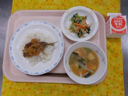 7月15日(金)の給食 公開日 2022/07/15 更新日 2022/07/15 給食室より 今日の献立は、 ・いわしのおろし添え丼 ・牛乳 ・じゃがいもと生揚げのみそ汁 ・ごまあえ です。 【食材産地】 米 新潟県 大根 青森県 にんじん 千葉県 たまねぎ 愛知県 じゃがいも 茨城県 ねぎ 茨城県 こまつな 群馬県 もやし 栃木県 いわし 千葉県 今日はいわしに片栗粉をつけて油で揚げ、おろしだれをかけた『いわしのおろし添え』をごはんにのせました。 いいね(0)
