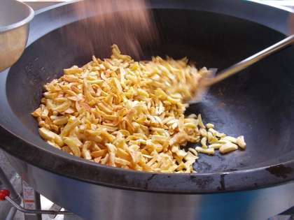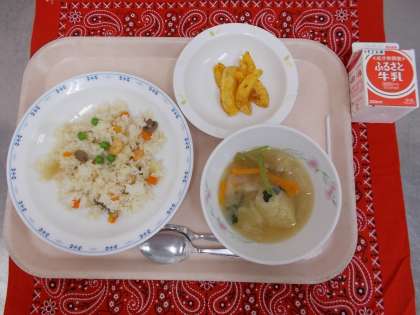 今日は、いい天気になり気温が上がっています。そこで、食欲増進効果をねらってスパイシーポテトを作りました。揚げた芋にスパイスを合わせた調味料をまぶしていきます。生徒たちの好みに合ったようで、残りはありませんでした。