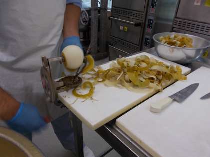 今日の果物は、今が旬の梨です。全部で80個以上の皮をむき、芯を取る作業はひと苦労。1枚目の写真にあるような『皮むき器』を使って、残った部分は包丁でむいていきます。