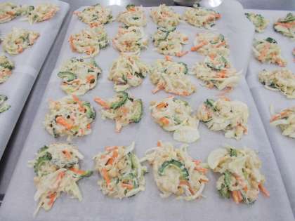 今日は、ゴーヤ入りのかき揚げを作りました。アイスクリームディッシャーを使って丸く成形したあと軽く整えて、油で揚げます。ゴーヤの苦みも気にならず、どのクラスもよく食べてくれていました。