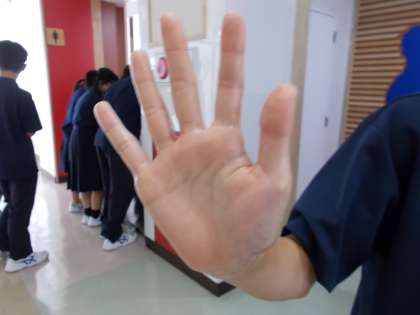 今日、スタンプを手におして手洗いを行っているのは1年生です。『きれいになりました!』と手のひらを見せてくれました。