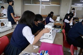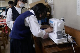 2年生の家庭科では巾着袋を制作中。今は家にミシンがない生徒がほとんどなので、糸かけからが勉強。上の写真は糸かけのテストを受けているところです。隣同士でミシンの操作を教え合っている姿も見られます。