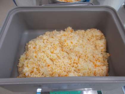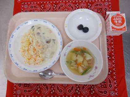 今日は、キャロットライスにエビ入りのクリームソースをかける『エビクリームライス』です。みじん切りにしたにんじんと少しのサラダ油をごはんに炊き込みました。炊きあがると、色鮮やかなキャロットライスになります。クリームソースはエビの色が活きるよう、にんじんは入れませんでした。