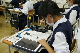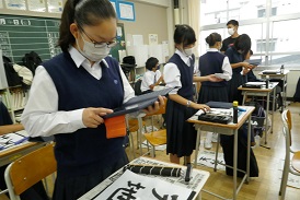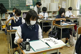 国語は書写の時間でした。1年生は小学校で学習してきたとめ・はね・はらいや始筆・終筆のさばきの確認から始まっています。