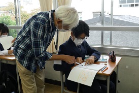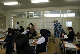 1年生の数学です。今日は担当の先生のほかにも、学生ボランティアさんやスクールサポートスタッフが授業に入って、方程式の文章題に取り組んでいました。教えてくれる人がたくさんいるので心強いですね。
