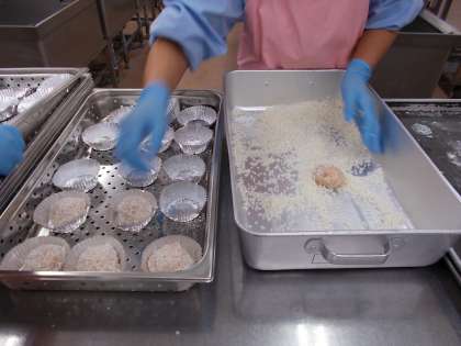 今日は、珍珠丸子を作りました。肉だねを作り、朝から水に漬けておいたもち米をまぶしてスチームコンベクションオーブンで時間をかけて蒸していきます。肉団子が大きい!と喜んでいた生徒に実は豆腐とおからでかさ増ししてあることを伝えると、『わかっていました』との返事が。豆の風味を感じずにボリュームが出せるよう、さらにレシピの改良を行います。