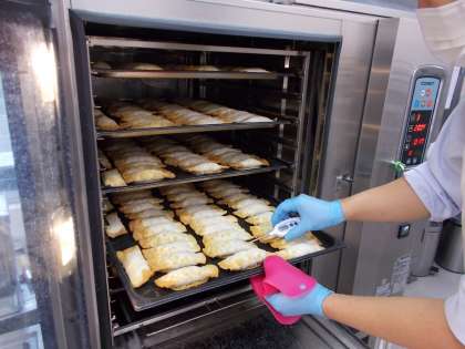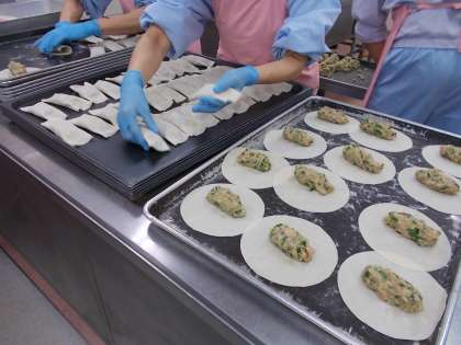 今日は『棒ぎょうざ』を作りました。丸いぎょうざの皮に具を包み、ごま油を塗ってオーブンで焼きます。奥沢中学校給食室の調理員さんたちは無駄な動きが一切なくスピーディーに、かつ丁寧にひとつひとつ作ってくださいます。キムチチャーハンには、豚レバーを加えて鉄分強化をはかっています。