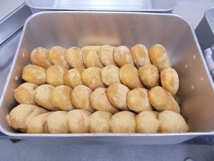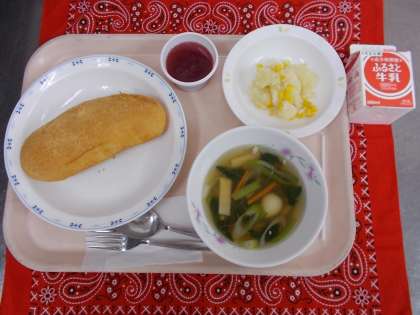 今日は久しぶりの揚げパンです。サンプルを見て『やったぁー!』と喜ぶ生徒が多かったです。1年生には大きく感じるかと思いましたが、ほとんど残りはありませんでした。エネルギーが不足しがちな献立のためポテトもつけましたが、こちらも残りはほぼ無し。中学生の食欲には驚かされます。