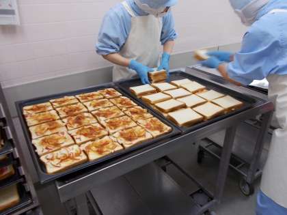 酸味のあるりんご『紅玉』を使ったアップルサンドを作りました。食パンにバター→りんご→シナモンシュガーの順にのせ、から焼きしたパンと組み合わせてサンドイッチを作ります。一度に95人分を焼き、リズムよく組み合わせ、カットしてパン箱におさめていおきます。