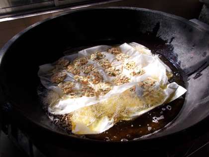 かき揚げを作る給食室は大忙し。切った具材と衣を合わせ、オーブンシートの上に丸く形作って、シートごと油に投入して60個ずつ揚げていきます。天つゆも給食室特製ですよ。