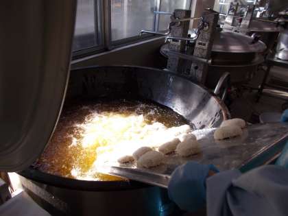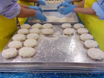 今日は、人気メニューのコロッケを作りました。1つ100gを超える大きなコロッケです。パンクしないよう、成形する際しっかり空気を抜いて衣をつけ、揚げる際は油の温度に気を付けて慎重に行っていきます。