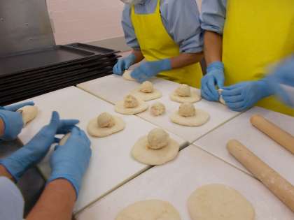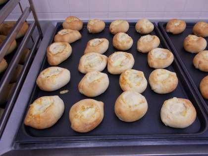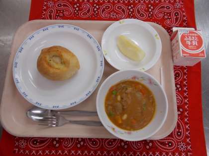 今日は、奥中給食室特製・手作りパンの日です。具のツナポテトを包み、チーズをのせて焼きました。手ごねで作った生地はよく発酵し、焼きあがった瞬間給食室はイーストの良い香りに包まれました。