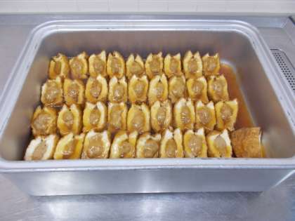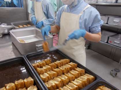 今日は、生揚げの肉詰めです。斜め半分に切った生揚げに肉だねを詰め、スチームコンベクションオーブンで1時間以上じっくり煮ていきます。煮汁に片栗粉でとろみをつけてかけて仕上げる、ボリュームあるおかずです。