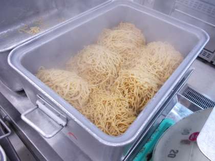 今日は、ラーメンのスープにキムチを加えたキムチラーメンです。卵も加えてあるので、辛さの中にもまろやかさがあります。蒸した麺をスープにつけて食べる『つけ麺タイプ』での提供です。
