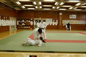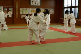 2年生女子は一年ぶりの柔道が始まっています。 ひざ車と支えつりこみ足の練習中です。みんな真剣!