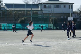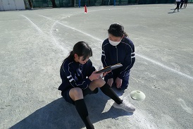 女子の体育は長距離。校庭ではペアの相手が「がんばれ」と大きな声で応援していました。それぞれが掲げた目標に向かって、記録を伸ばしています。