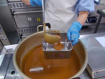 写真1枚目:加熱したたれをクラスごとに分けている様子