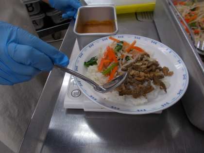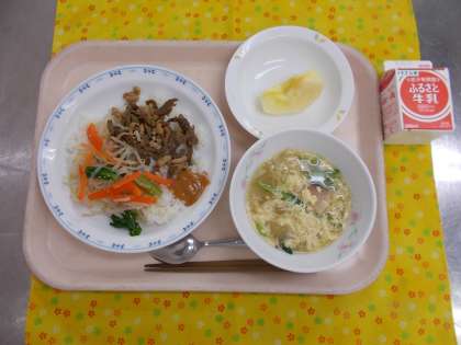 学校給食週間4日めの献立は、『世界の料理』です。韓国料理のビビンバと、トック(餅)が入ったスープです。