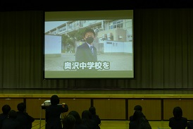 今日の生徒朝礼では、生徒会役員と2年生有志などで作成した奥中紹介動画が披露されました。