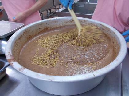 ケンジがお客さんからもらったココアパウダーを使って2人で作ったブラウニー(8巻)を給食で作りました。ローストしたくるみやラムレーズンも入れた本格派です。給食では本にあるレシピのようにバターや砂糖を多くは使えないため、どっしり濃厚というよりは軽めの仕上がりです。