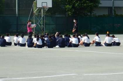 体育の授業です。体育祭に向けての練習が始まっています。リレーのバトンパスについて説明を聞いているところです。
