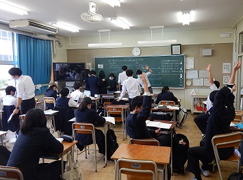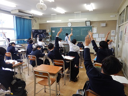 3年生の授業の様子です。因数分解の学習をしていました。積極的に挙手をして黒板の問題を解いていました。意欲的に取り組んでいて素晴らしいですね。