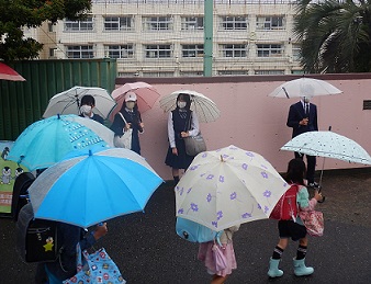 今日は5月のあいさつデーで東玉川小学校に行きました。あいにくの雨となってしまいましたが、生徒たちはしっかりと小学生に声をかけていました。