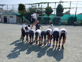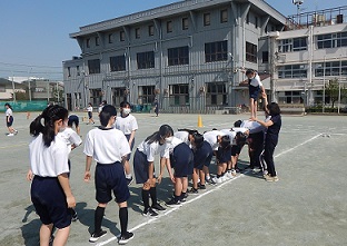 1年生の学年種目練習の様子です。背中の上を渡っていくのはバランスをとるのが難しいようです。馬となる人の動きもこの種目の大きなポイントです。