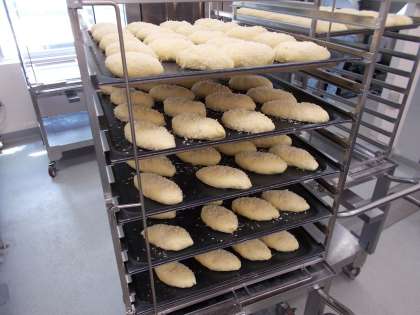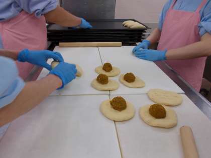 今日は給食室で生地から作る『手作り焼きカレーパン』です。粉を計量し、副材料を加えてこね、発酵させます。同時進行で具のカレーを作り、生地の発酵が終わったら分割して具を包みます。油をぬってパン粉をつけ、オーブンで焼いたら出来あがりです。手作りパンは年に数回のお楽しみ献立です。売れ行きも良く、どのクラスでもおかわり希望の手が多数挙がっていました。