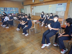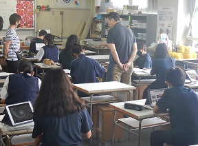 実技教科の授業の様子です。左は美術。図法について調べ、写真等の資料を元に課題に取り組んでいます。右は音楽。パートに分かれて座っていました。これから声出しをするという場面でした。