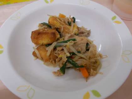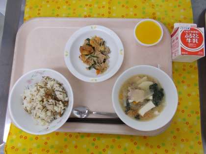 今日6月23日は、沖縄慰霊の日です。そこで、沖縄県の料理を集めました。じゅーしいは炊き込みご飯、イナムドゥチは豚汁、フーチャンプルーは炒め物です。そこに、沖縄県でとれるシークワーサ—を使ったゼリーを合わせました。