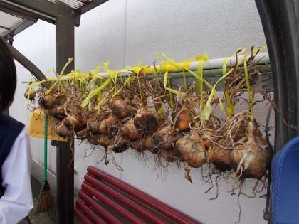 6月23日(金)、保健給食委員会の活動でたまねぎ収穫を行いました。昨年度の後期保健給食委員会が11月に植えたものが、約7か月で大きく育ちました。乾燥させて、7月の給食に使用する予定です。