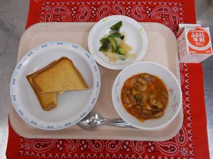 今日は、ツナポテトを具にした『ツナポテサンド』です。チーズをのせてオーブンで焼き、カットしました。主菜のチリコンカンは、ルーなしのさっぱりタイプ。夏向けのさらっとした仕上がりになりました。蒸し暑くて食欲も落ちてしまいがちですが、暑さに負けない体づくりのためにも、給食をしっかり食べてくれるとうれしいです。