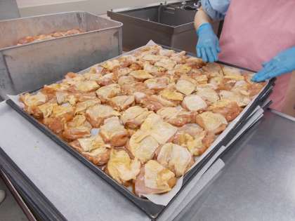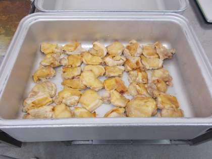 今日は、ゆずこしょうがほんのり香る『鶏肉のゆずこしょう焼き』です。こしょうという名前ですが、こしょうではなく唐辛子が使われている九州の調味料です。使いすぎると辛いので、今日は1人0.3g、全体で150gと控えめに使いました。ゆずこしょうを常備しているご家庭も多いと思います。今月の献立表でレシピ紹介をしているので、ぜひ作ってみてください。