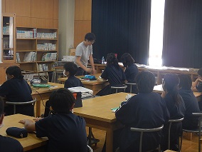 ゲストティーチャーの先生がいらっしゃいました。教科は理科。1年生の2クラスに順に授業をしていただきました。「こんぶ」から海の環境を考える内容で、興味深く先生の話聴いている様子が見られました。