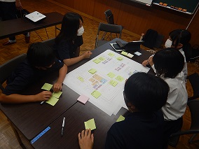 校舎改築に向けて奥沢中学校の生徒がどのように考えているか。グループで意見を出し、建築設計の方と話す機会がありました。各学年からの代表生徒が、奥沢中の改築とあわせて児童館ができることを踏まえ「どのような学校にしたいか」「地域とのかかわりについてどう考えるか」について活発に意見交換を行いました。