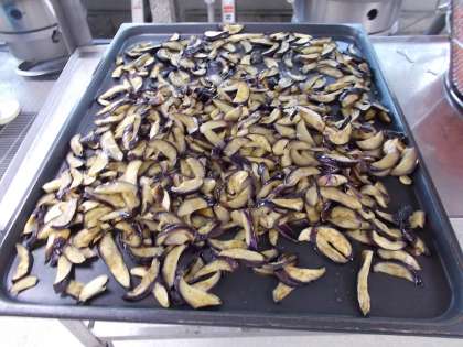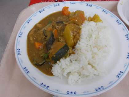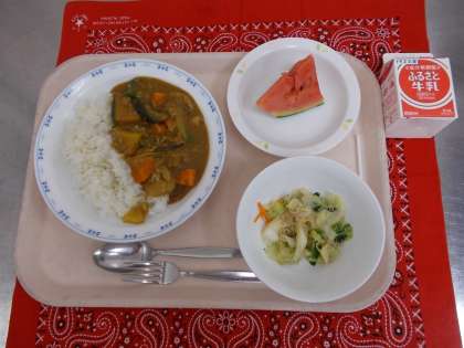 今日は、夏野菜をたっぷり使ったカレーライスです。かぼちゃは蒸しておき、なすはオーブンで揚げなす風にして色と形がきれいに残るよう仕上げました。カレールウの香りで、朝から『今日はカレーだ!』とわくわくしていた生徒もいました。猛暑で給食室内は33度を超える中、調理師さんたちは汗をかきながら調理してくださいました。