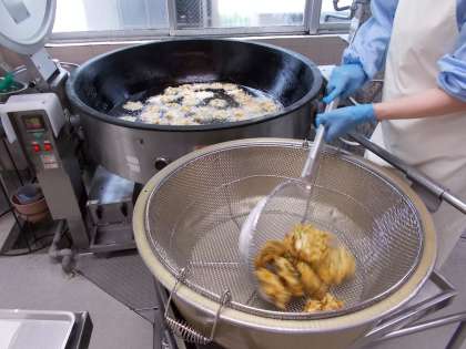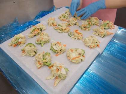 今日は、ゴーヤをかき揚げに入れました。野菜と衣を合わせて1つずつ成型し、油で揚げていきます。3年生からは『ゴーヤが苦くなくて初めて食べられました!』という感想をもらいました。揚げてあると食べやすいと思います。苦手な食べ物が少しずつ減らせるといいですね。