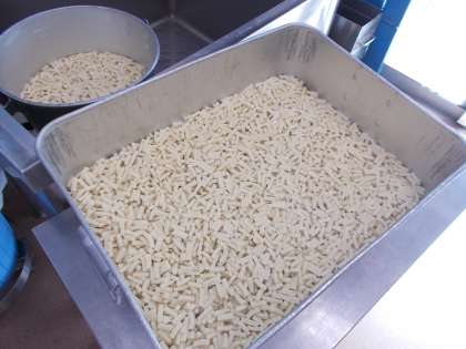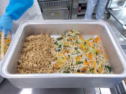 1枚めの写真は、肉の使用量を抑えるために使用した高野豆腐です。業務用食品にはこのような細切りのものがあるので、給食ではしばしば登場します。