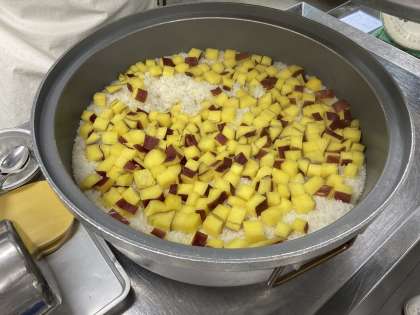 今日は、今が旬のさつまいもをごはんに炊き込みました。炊き上がると、さつまいもが黄金色に!くずれないようさっくり混ぜて、黒ごまを散らしました。