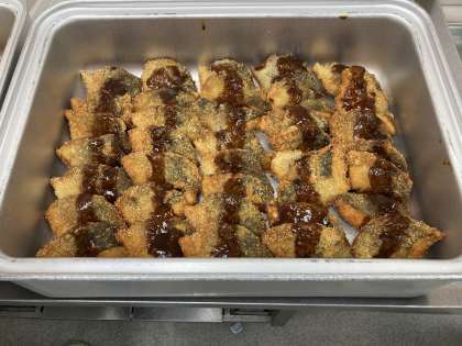 フライに使った魚はマスです。鮭に似た感じですが、こちらは少しリーズナブルな魚です。鮭、さんまなどの値上がり幅が大きく、ほかの食材の値上がりも行われているため、1食単価が決まっている給食では、お買い得な食材を使いながらの運営になっています。