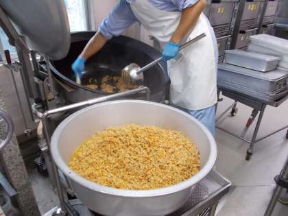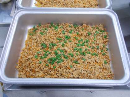 今日のそぼろ丼には、高野豆腐をたっぷり使っています。鶏ひき肉とみじん切りに切った野菜(にんじん、干ししいたけ、ねぎ)、それに高野豆腐を炒りつけて味付けします。さやいんげんは、最後に上掛けしています。
