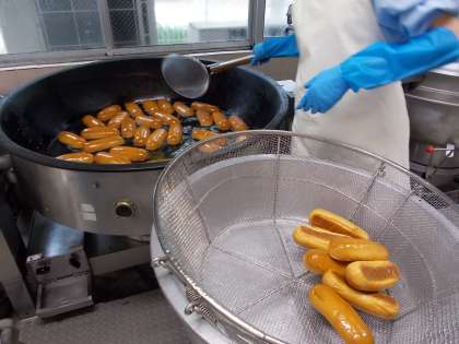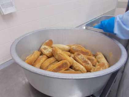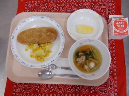 国の第4次食育推進基本計画(令和3年3月策定)では、学校給食における国産食材の使用割合を令和元年度の全国平均87%から維持・向上した都道府県の割合を90%とすることを目指すとしています。そこで今日は、国産米粉を一部使用した『米粉入りパン』で揚げパンを作りました。米粉が入っているので、少しもっちりした食感に仕上がりました。ほかの野菜・くだものはすべて国産を使用しています。