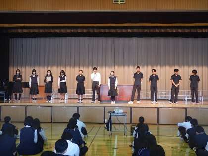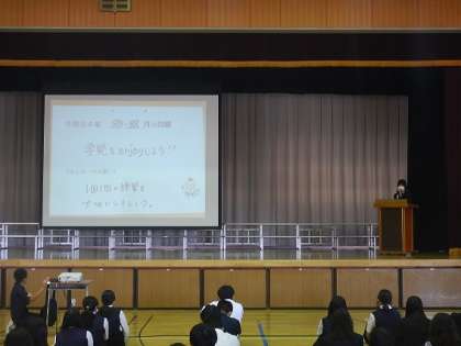 左の写真は、前期の委員長が引き継ぎの挨拶をする様子です。右の写真は、後期第1回の生徒会朝礼の様子です。