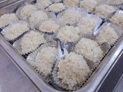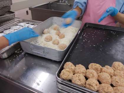 珍珠丸子は、「肉団子のもち米蒸し」です。蒸しあがったもち米が真珠のようであることから、この字があてられています。今日は、豆腐やおからも加えた肉団子で作りました。給食ではたくさんの肉を使えないので、ボリュームを出すために様々な材料を使っています。