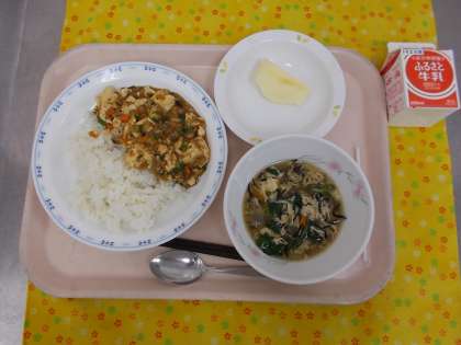 今日は、久しぶりの麻婆豆腐です。世田谷区では衛生管理のため、大量の豆腐を使用する献立は6月〜9月は実施しないことになっているためです。今日使った豆腐は75kg!やわらかい豆腐だったので大きめにカットして使用しました。鉄分強化のため、豚レバーミンチも加えています。