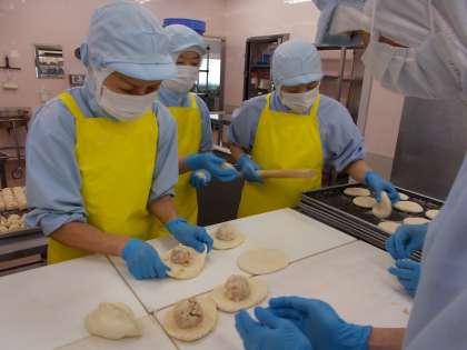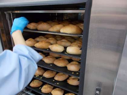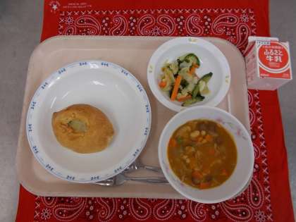 今日は、給食室で生地から作る手作りパンです。具はツナポテトを包み、上にチーズをのせて焼いています。強力粉と副材料を合わせて練り一次発酵が終わると、給食室にはイーストのいい香りがします。調理師さんたちも慣れたもので、スピーディーに包んで二次発酵へ。2回に分けて焼いて、完成です。生徒はおかわり希望の手がたくさん挙がり、職員からも大好評でした。