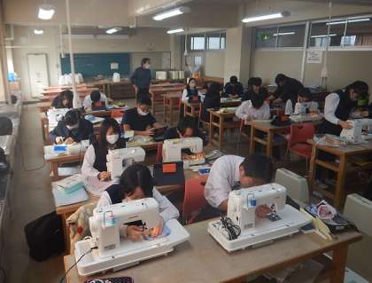 家庭科の授業の様子です。ミシンを使って作品を作っているまなざしは真剣です。