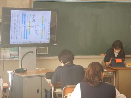授業の様子 公開日 2023/11/09 更新日 2023/11/09 できごと 国語の授業の様子です。 教科書を表示して、説明をしながら画面に書き込んでいます。 また、ペアで古文を読む活動も行っていました。 いいね(0)