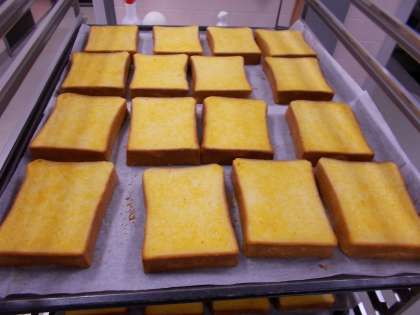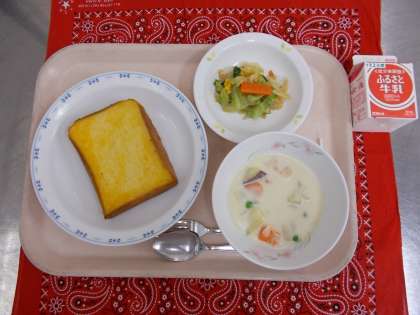 今日は、オレンジジュース・卵・砂糖・バターを合わせた調味液に無塩食パンをひたして焼いた『オレンジフレンチトースト』です。蒸気も加えて焼くので、耳までふんわりと仕上げることができました。